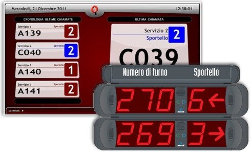 Display riepilogativi delle chiamatePannello elettronico dotato di display a 3 cifre per l'indicazione del numero progressivo, display a 2 cifre con l'indicazione del numero di sportello e display con lettera per indicare la funzione/servizio chiamato.Il riepilogativo è componibile con un numero variabile di display, per visualizzare lo storico delle ultime chiamate.Riepilogativi LCDIn alternativa ai classici riepilogativi a display il sistema prevede la possibilità di installare dei monitor LCD di grandi dimensioni che visualizzano contemporaneamente le chiamate a svariati servizi, tempi di attesa , data e ora , ...