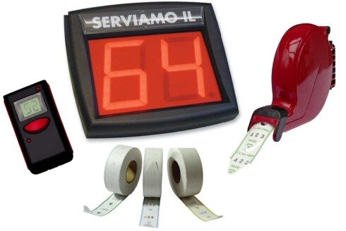 Emettitori di ticketUnità, generalmente dislocata all'ingresso del locale, per generare i ticket numerati per la prenotazione. L'erogatore può essere di 2 tipi: erogatore manuale (chiocciola) o sistemi touch-screenErogatore manuale (chiocciola)E' un semplicissimo distributore di ticket cartacei numerati progressivamente, mono servizio, fissabile a muro o su piantana da pavimento.Erogatore touch-screenDistributore informatizzato su totem touch screen, completamente configurabile, multi-servizio, provvisto di stampante termica, interfaccia ethernet per collegamento in rete.