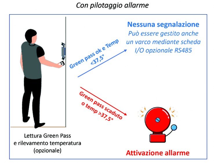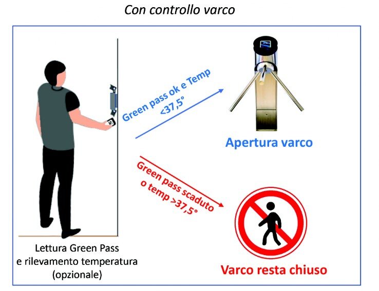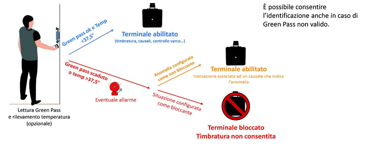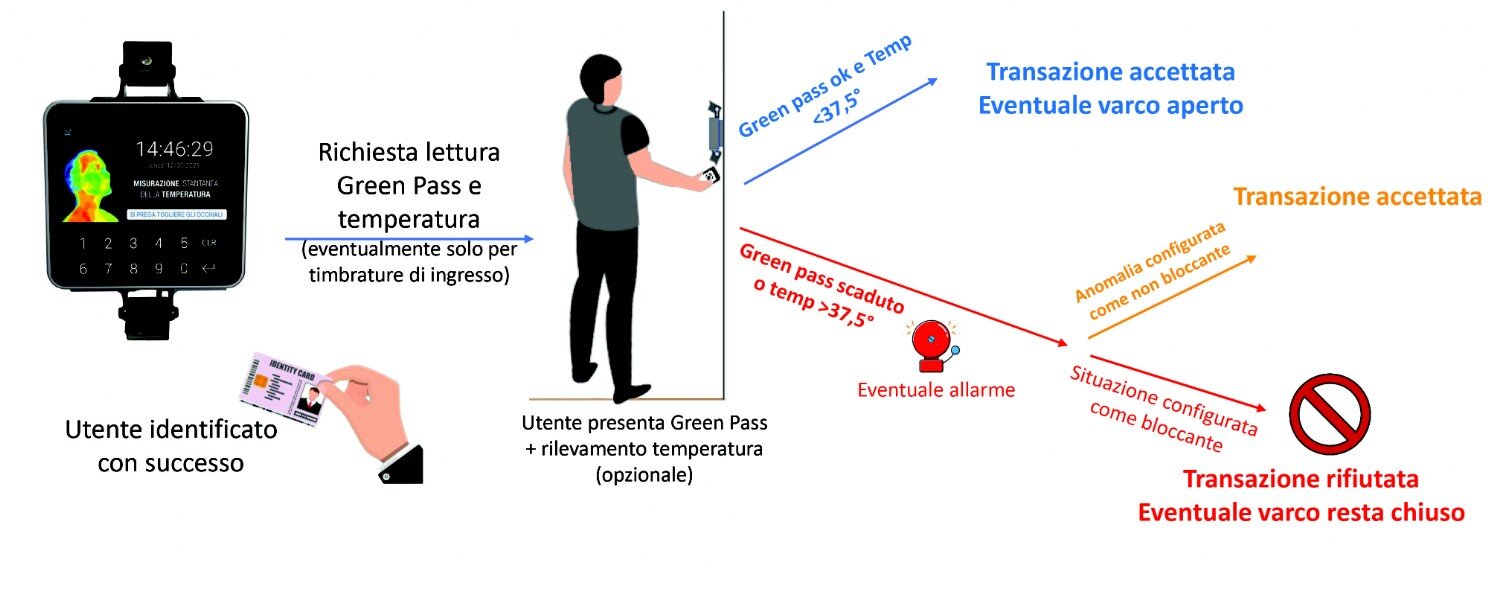 SOLUZIONE 2 - CON IDENTIFICAZIONE DELL'UTENTEAll'identificazione dell'utente si aggiunge la lettura del Green Pass (ed eventualmente il rilevamento della temperatura)Il Green Pass può essere richiesto prima o dopo l'identificazione dell'utenteIdeale per aziende o luoghi con verifica di titolo di accesso